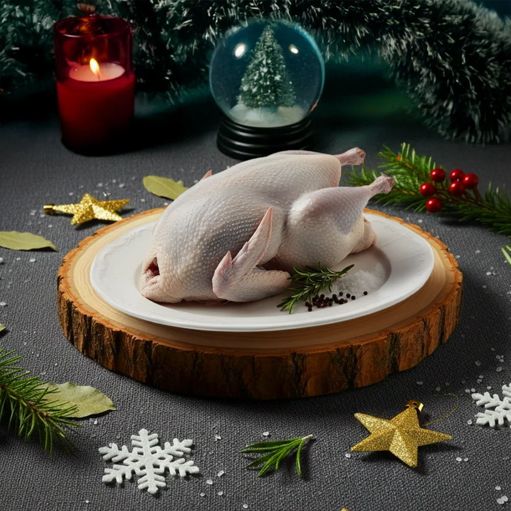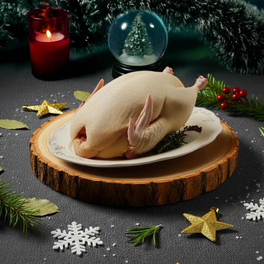 Oie fermière entière. Viande riche et goûteuse, parfaite pour un dîner de Noël traditionnel.