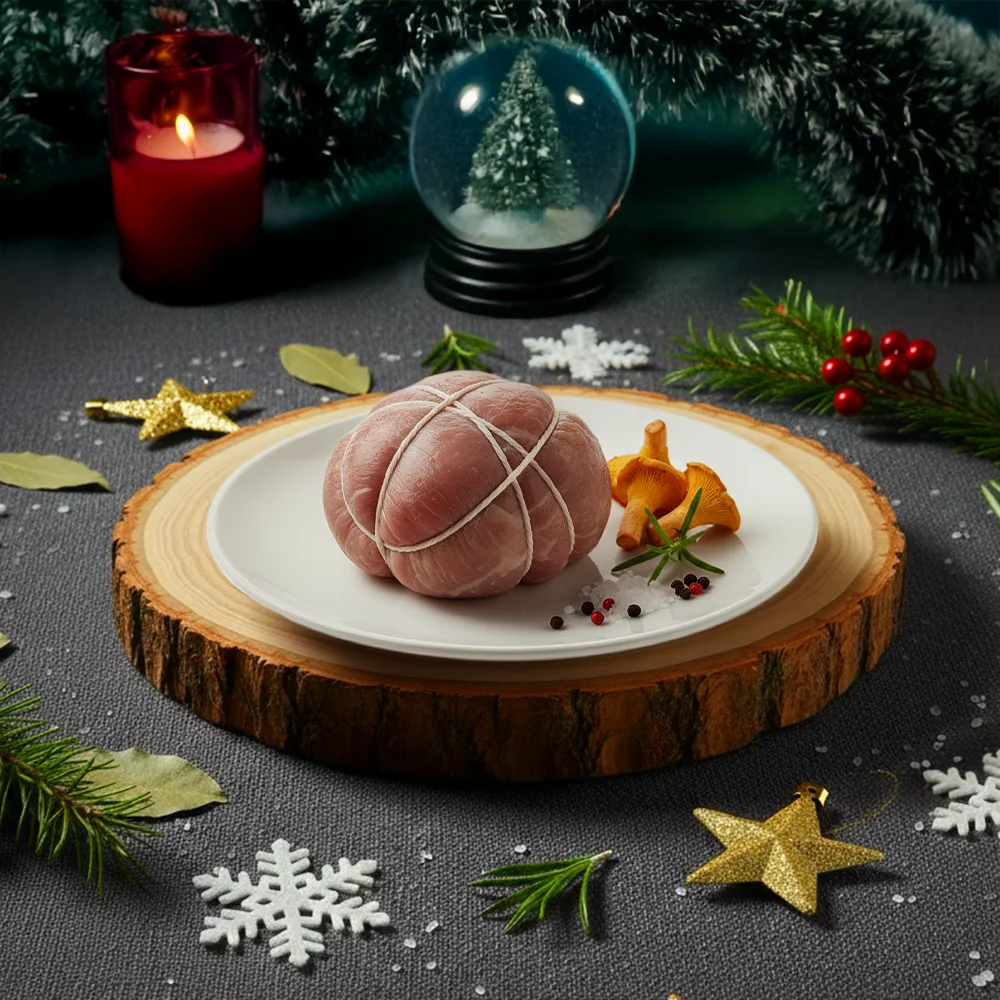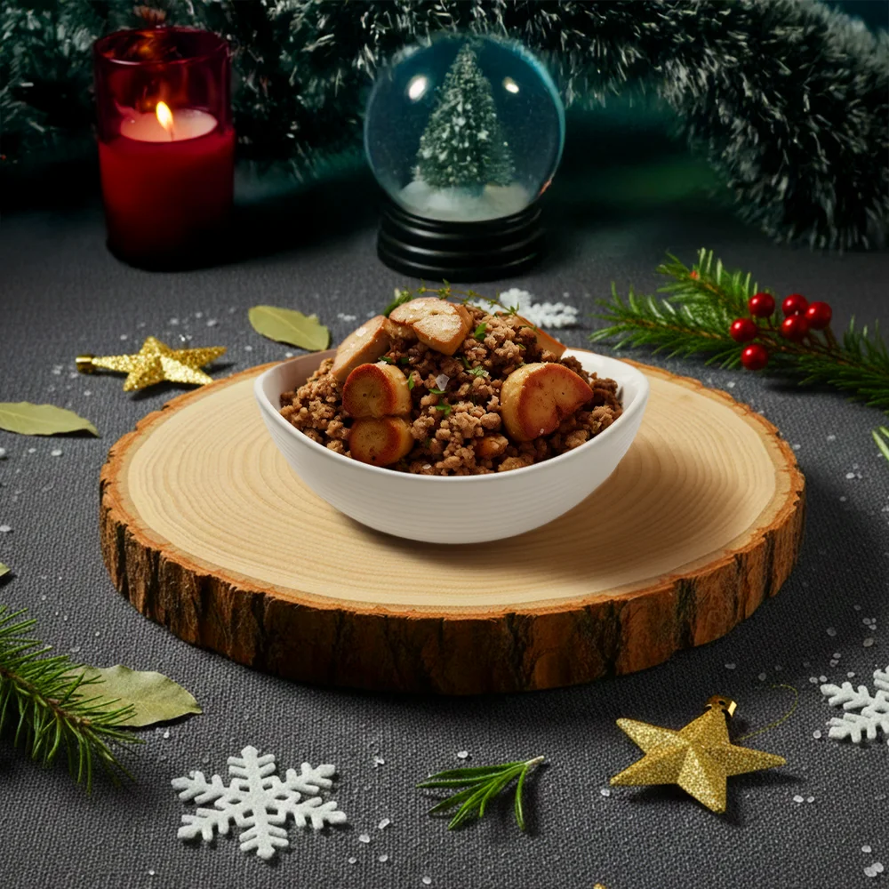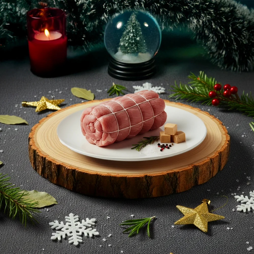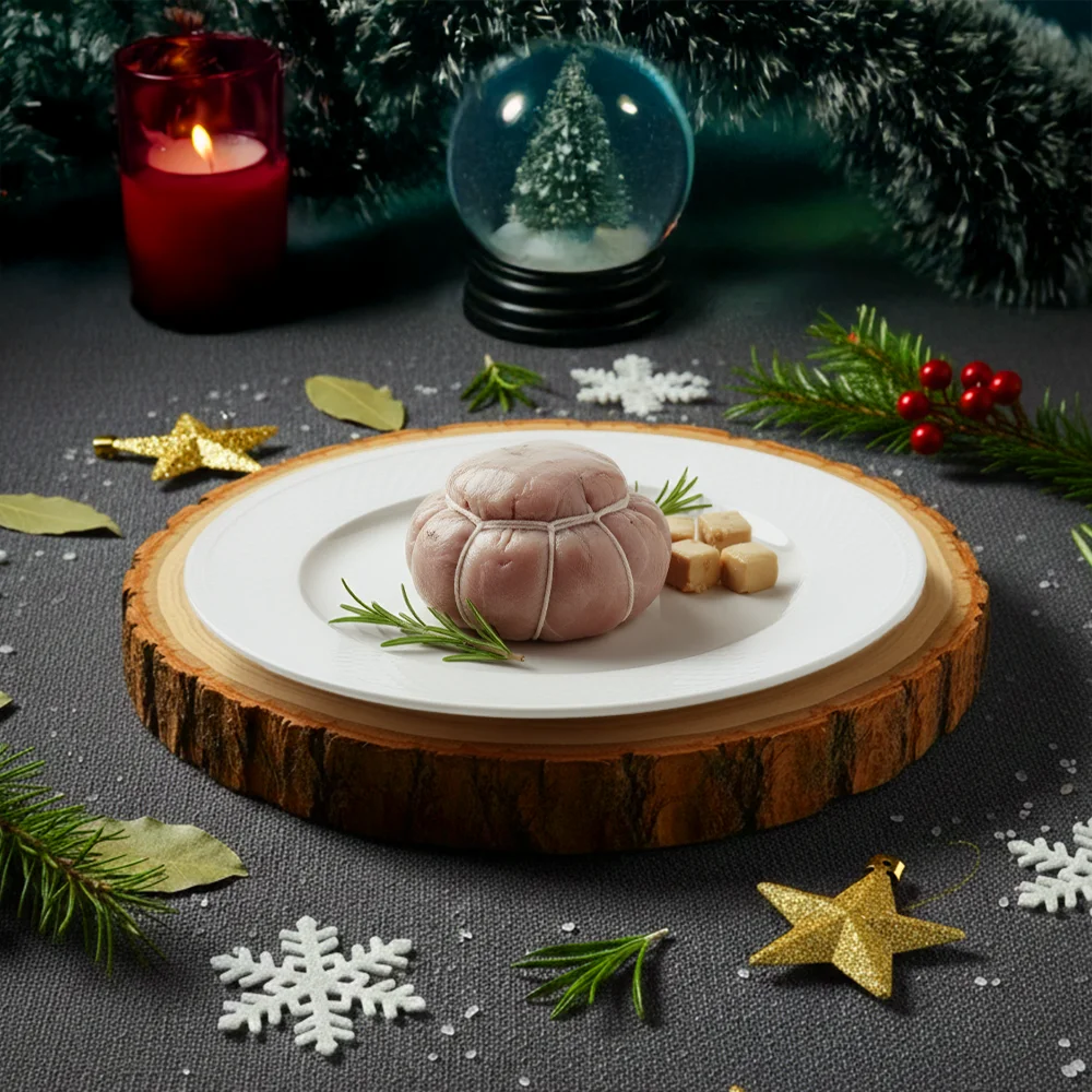 Farce généreusement enrichie de morceaux de Foie Gras. Une touche de luxe indispensable pour l’opulence des fêtes.