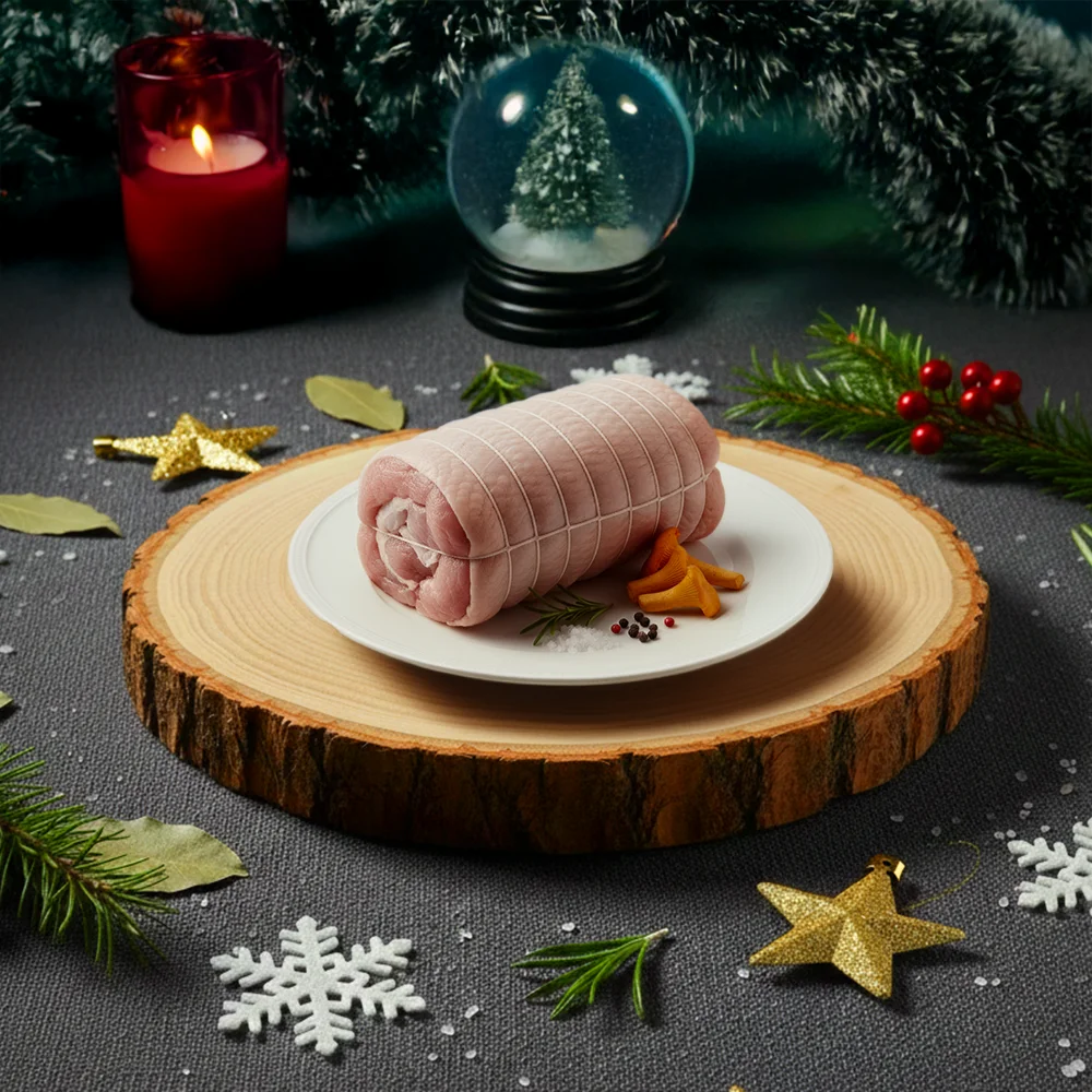 Rôti de chapon désossé, farci aux Girolles. Ficelé, prêt à cuire.